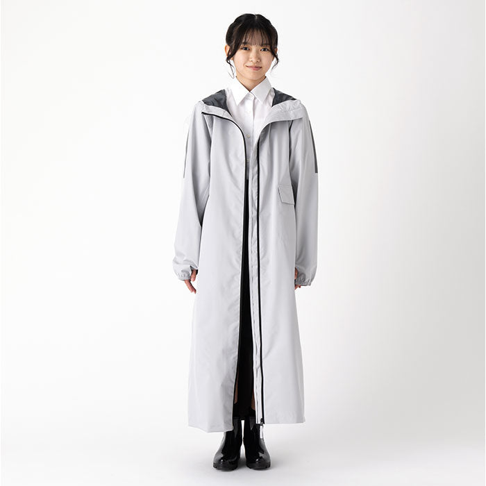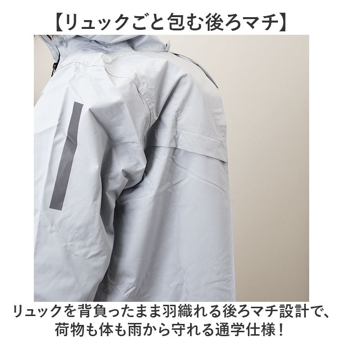 ・リュックを背負ったまま羽織れる後ろマチ設計で、荷物も体も雨から守れる通学仕様!