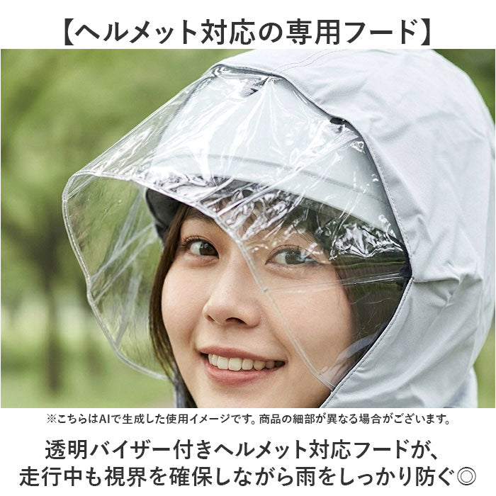 ・透明バイザー付きヘルメット対応フードが、走行中も視界を確保しながら雨をしっかり防ぐ◎