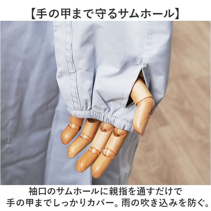 ・袖口のサムホールに親指を通すだけで手の甲までしっかりカバー。雨の吹き込みを防ぐ。