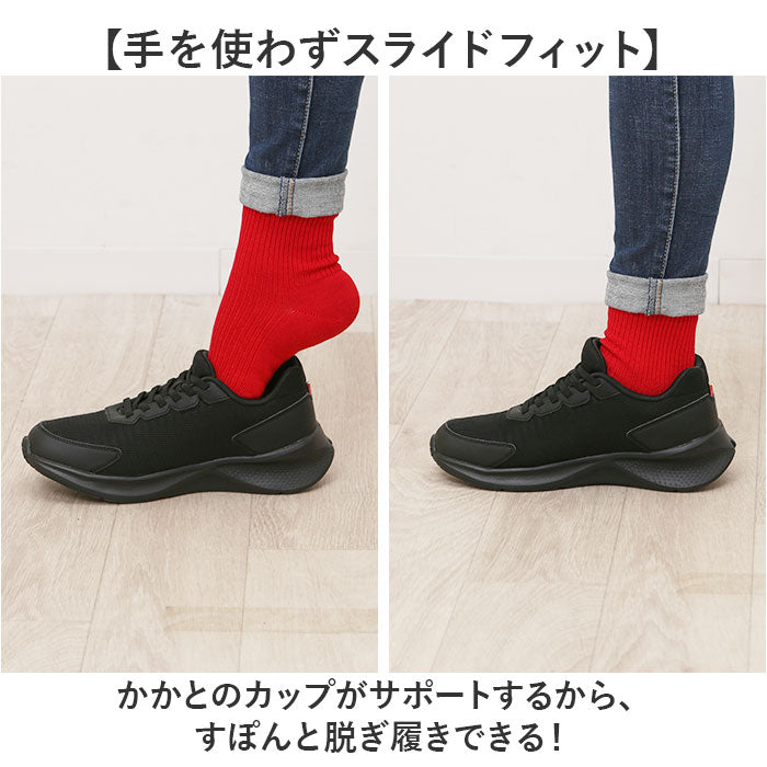 【手を使わずスライドフィット】かかとのカップがサポートするから、すぽんと脱ぎ履きできる!