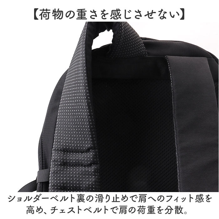 ・ショルダーベルト裏の滑り止めで肩へのフィット感を高め、チェストベルトで肩の荷重を分散。長時間の歩行でも疲れにくい設計。