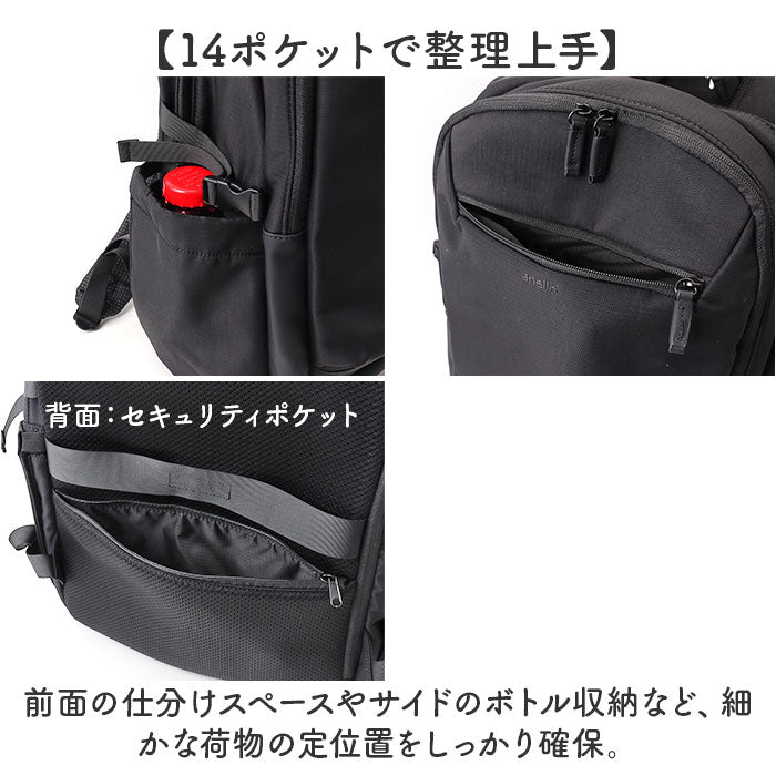 ・前面の仕分けスペースやサイドのボトル収納など、細かな荷物の定位置をしっかり確保。背面のセキュリティポケットで貴重品も安全♪