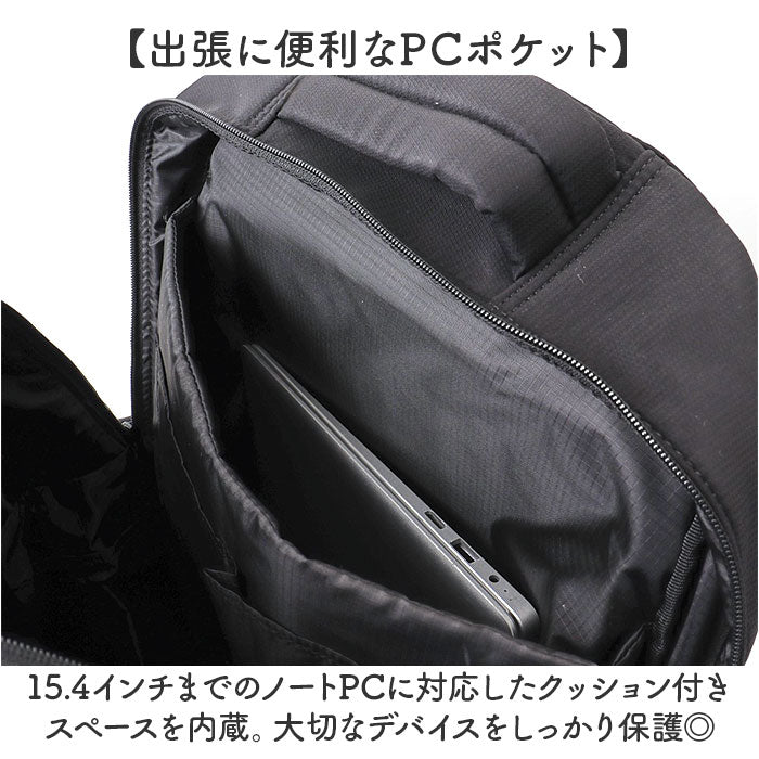 15.4インチまで対応のノートPC専用のクッション付きスペースを内蔵し、大切なデバイスをしっかり保護できる構造◎