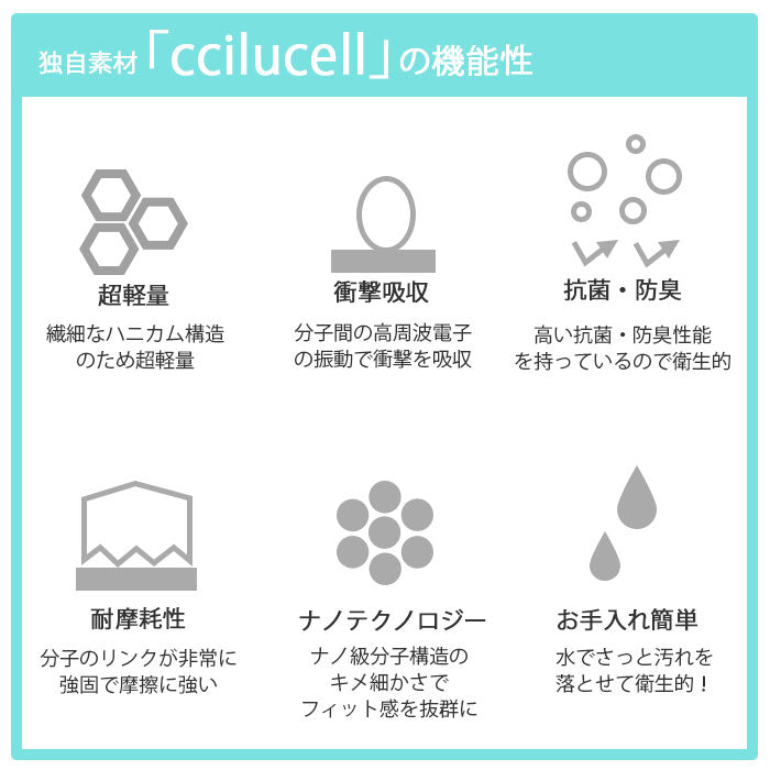 ・ccilucell(チルセル)とは…cciluの各シリーズで使用されている主な材料で、特有のナノ調剤により比類のない軽さとテクノロジーを実現。様々な国際環境基準に適合したECO素材。お手入れもカンタン。