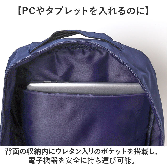・背面の収納内にウレタン入りのポケットを搭載し、電子機器を安全に持ち運び可能。