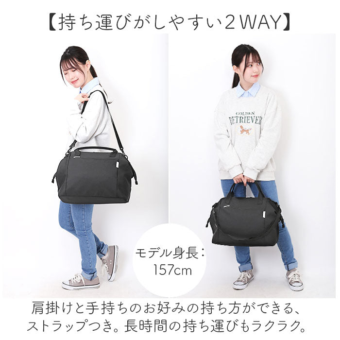 ・肩掛けと手持ちのお好みの持ち方ができる、ストラップつき。長時間の持ち運びもラクラク。