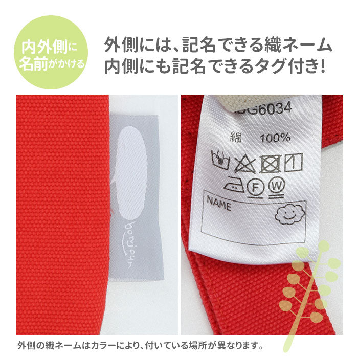 ・外側には、記名できる織ネーム付き。内側にも記名できるタグ付きで、お友達の物と間違える心配なし。(外側の織ネームはカラーにより、付いている場所が異なります。)