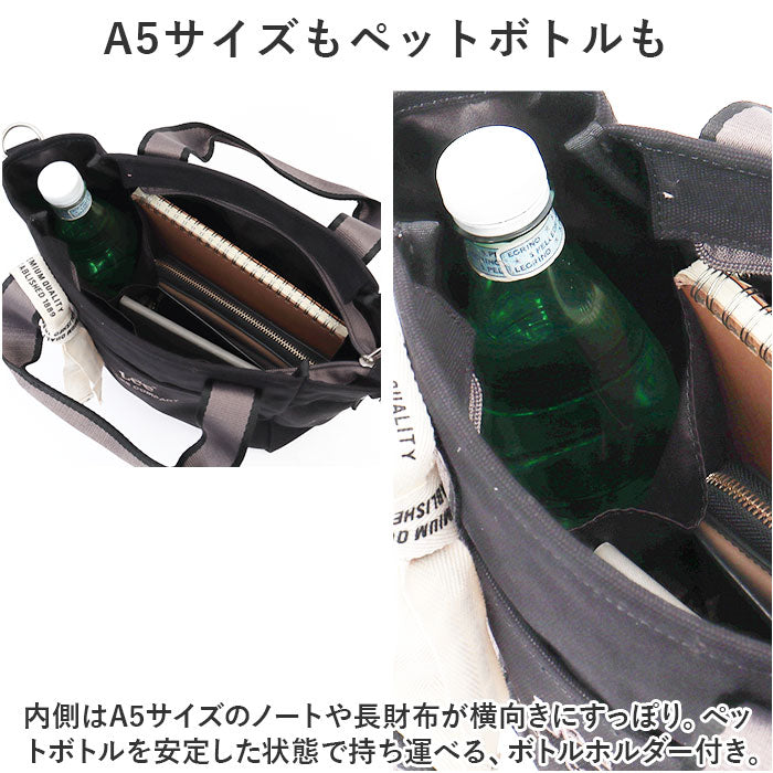 ・内側はA5サイズのノートや長財布が横向きにすっぽり。ペットボトルを安定した状態で持ち運べる、ボトルホルダー付き。