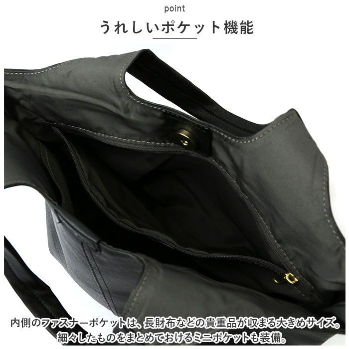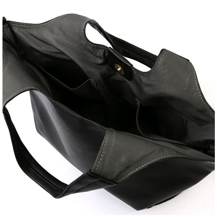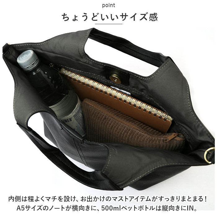 ・内側は程よくマチを設け、お出かけのマストアイテムがすっきりまとまる!A5サイズのノートが横向きに、500mlペットボトルは縦向きにIN。