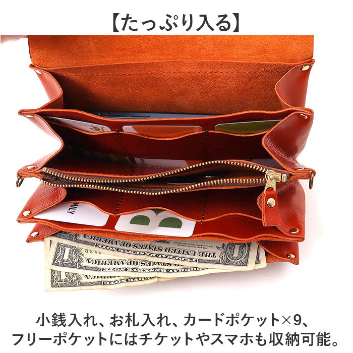 ・小銭入れ、お札入れ、カードポケット×9、フリーポケットにはチケットやスマホも収納可能。
