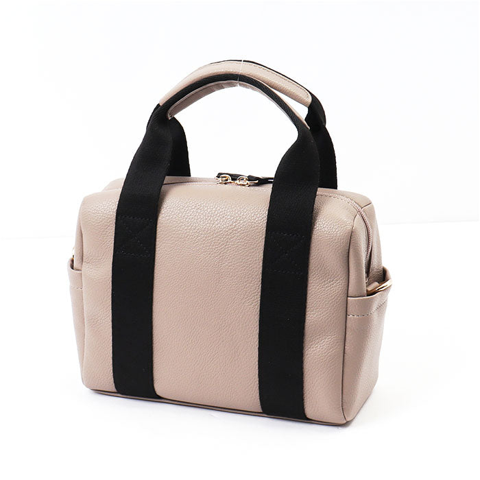 ・本体は手触り柔らか、シボ感のあるPUレザー素材。ハンドルはコットンとレザーを組み合わせて強度をプラスし、デザインのアクセントにも。