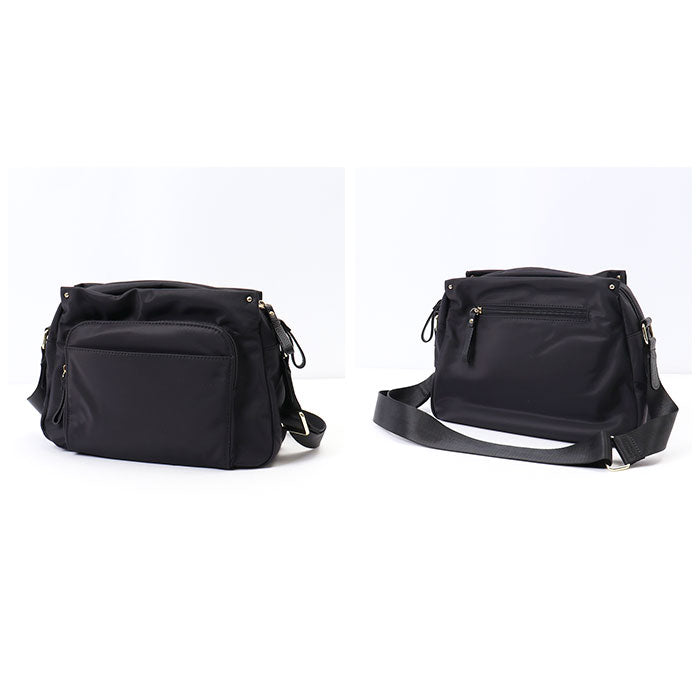 ・サラッとした質感で程よい光沢感のあるナイロン素材を使用。部分的にフェイクレザーやゴールド金具を取り入れ、カジュアルすぎない仕上がりに。