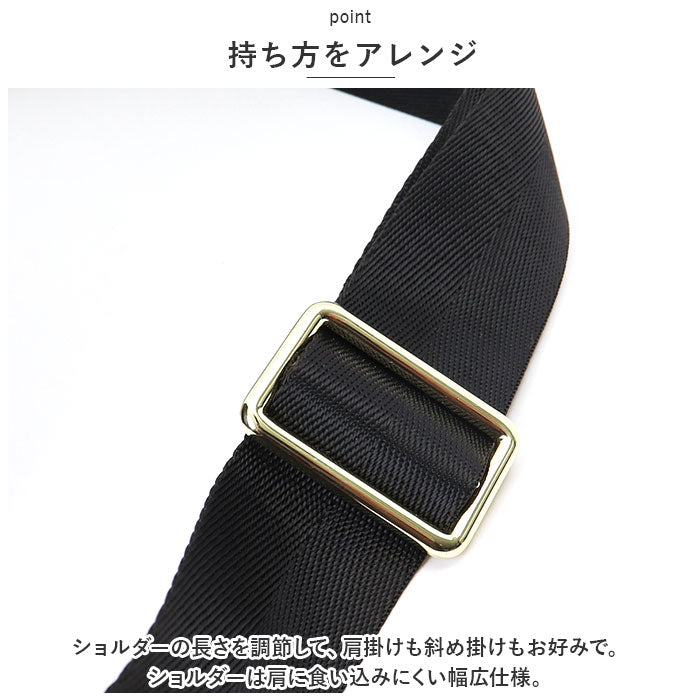 ・ショルダーの長さを調節して、肩掛けも斜め掛けもお好みで。ショルダーは肩に食い込みにくい幅広仕様。