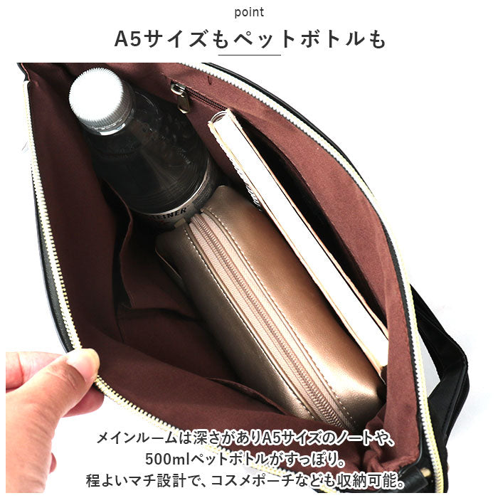 ・メインルームは深さがありA5サイズのノートや、500mlペットボトルがすっぽり。程よいマチ設計で、コスメポーチなども収納可能。