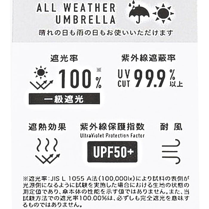 ・紫外線保護指数は安心のUPF50+。晴れの日も大活躍な日差し&UV対策機能付き。UVカット率99.9%以上、遮光率100%、遮熱効果のある生地を採用。