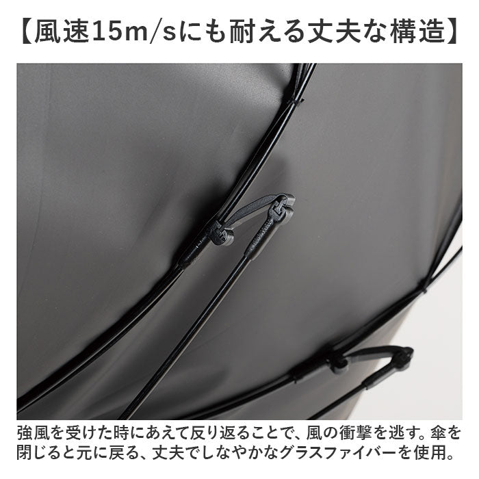 ・強風を受けた時にあえて反り返ることで、風の衝撃を逃す。傘を閉じると元に戻る、丈夫でしなやかなグラスファイバーを使用。