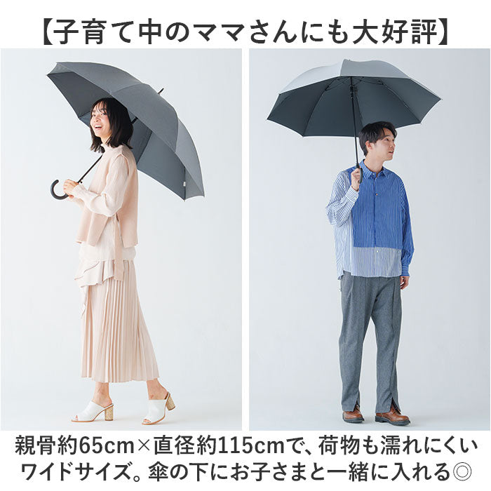 ・親骨約65cm×直径約115cmで、荷物も濡れにくいワイドサイズ。傘の下にお子さまと一緒に入れる◎