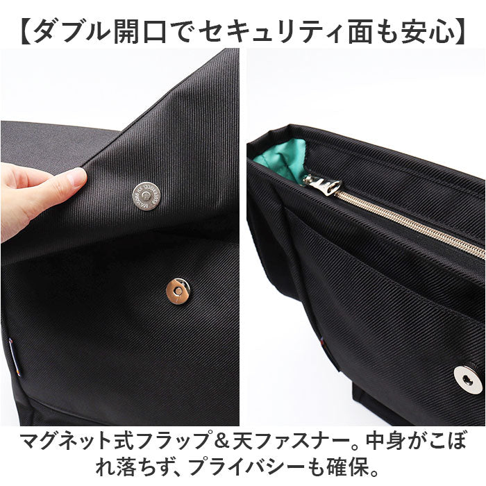 ・マグネット式フラップ&天ファスナー。中身がこぼれ落ちず、プライバシーも確保。