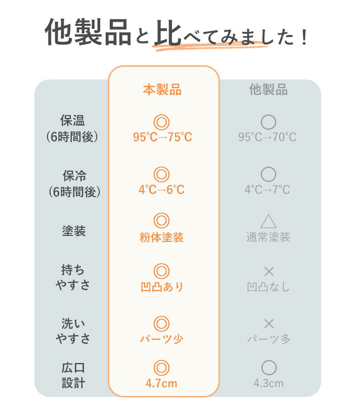 ※保温効力とは、室温20度±2度において製品に95度±1度の熱湯をフタ栓下端まで満たし、24時間及び6時間放置した場合におけるその湯の温度。