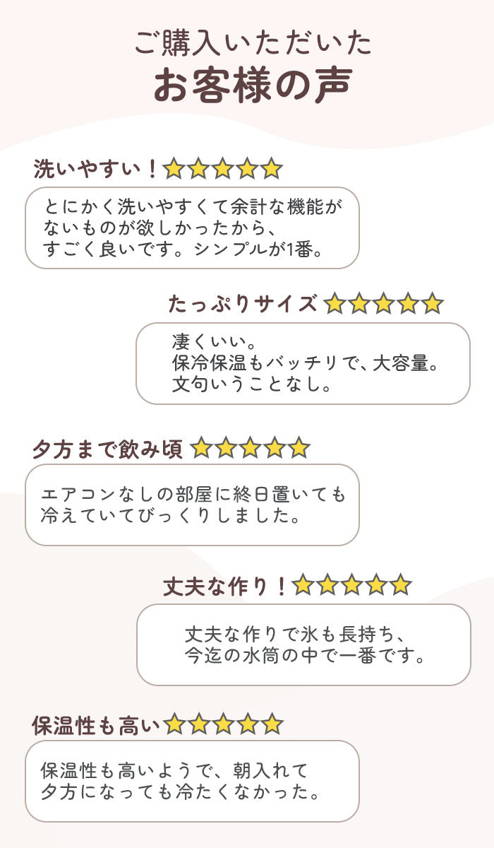 ※保冷効力とは、室温20度±2度において製品に4度±1度の冷水をフタ栓下端まで満たし、6時間放置した場合におけるその水の温度。