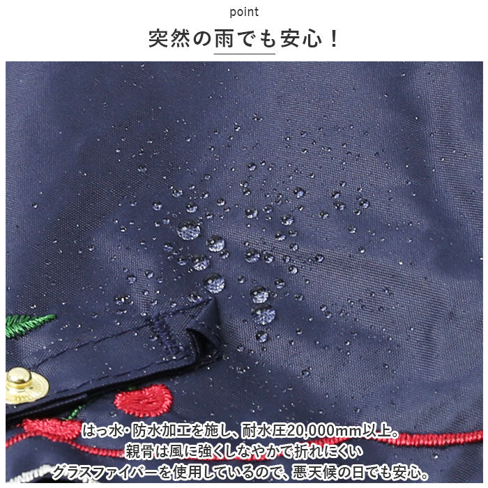 ・突然の雨でも安心!はっ水・防水加工を施し、耐水圧20,000mm以上。親骨は風に強くしなやかで折れにくいグラスファイバーを使用しているので、悪天候の日でも安心。