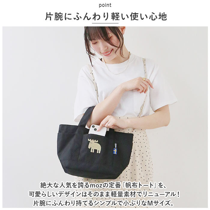 ・絶大な人気を誇るmozの定番「帆布トート」を、可愛らしいデザインはそのまま軽量素材でリニューアル!片腕にふんわり持てるシンプルで小ぶりなMサイズ。