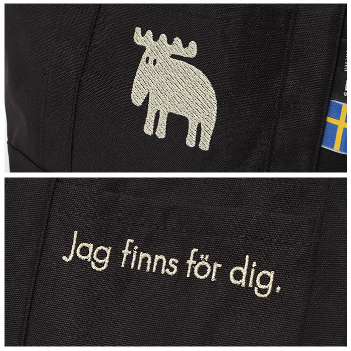 ・フロントには、mozのトレードマーク「エルク(ヘラジカ)」の刺繍をほっこり可愛らしくデザイン。背面のテキストはスウェーデン語で「僕はあなたのためにここにいるよ」という意味のメッセージ。