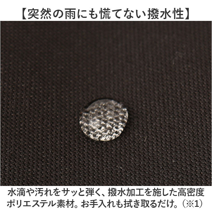 ・水滴や汚れをサッと弾く、撥水加工を施した高密度ポリエステル素材。お手入れも拭き取るだけ。
