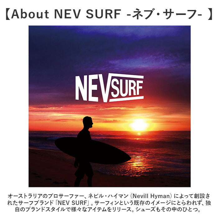 ・オーストラリアのプロサーファー、ネビル・ハイマン(Nevill Hyman)によって創設されたサーフブランド「NEV SURF」。サーフィンという既存のイメージにとらわれず、独自のブランドスタイルで様々なアイテムをリリース。シューズもその中のひとつ。