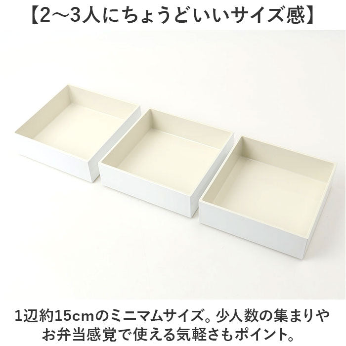 1辺約15cmのミニマムサイズ。少人数の集まりやお弁当感覚で使える気軽さもポイント。