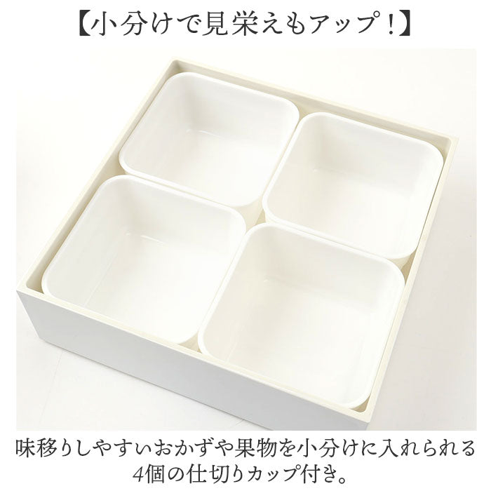 ・味移りしやすいおかずや果物を小分けに入れられる4個の仕切りカップ付き。