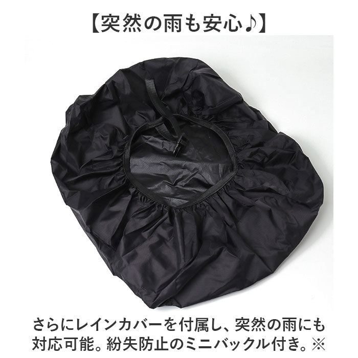 ・さらにレインカバーを付属し、突然の雨にも対応可能。紛失防止のミニバックル付き。※