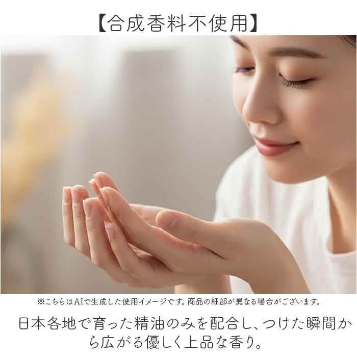 【合成香料不使用】 日本各地で育った精油のみを配合し、つけた瞬間から広がる優しく上品な香り。