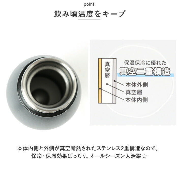 ・本体内側と外側が真空断熱されたステンレス2重構造なので、保冷・保温効果ばっちり。オールシーズン大活躍☆