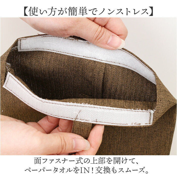 ・面ファスナー式の上部を開けて、ペーパータオルをIN!交換もスムーズ。
