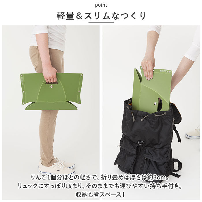 ・りんご1個分ほどの軽さで、折り畳めば厚さは約3cm。リュックにすっぽり収まり、そのままでも運びやすい持ち手付き。収納も省スペース!