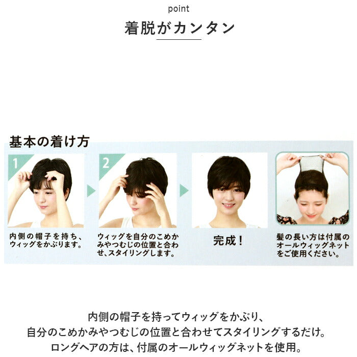 ・内側の帽子を持ってウィッグをかぶり、自分のこめかみやつむじの位置と合わせてスタイリングするだけ。ロングヘアの方は、付属のオールウィッグネットを使用。