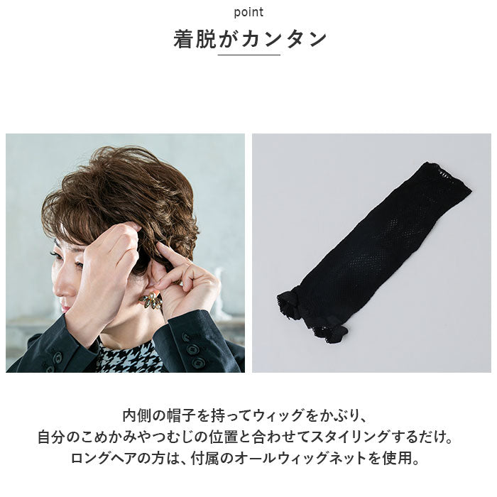 ・内側の帽子を持ってウィッグをかぶり、自分のこめかみやつむじの位置と合わせてスタイリングするだけ。ロングヘアの方は、付属のオールウィッグネットを使用。