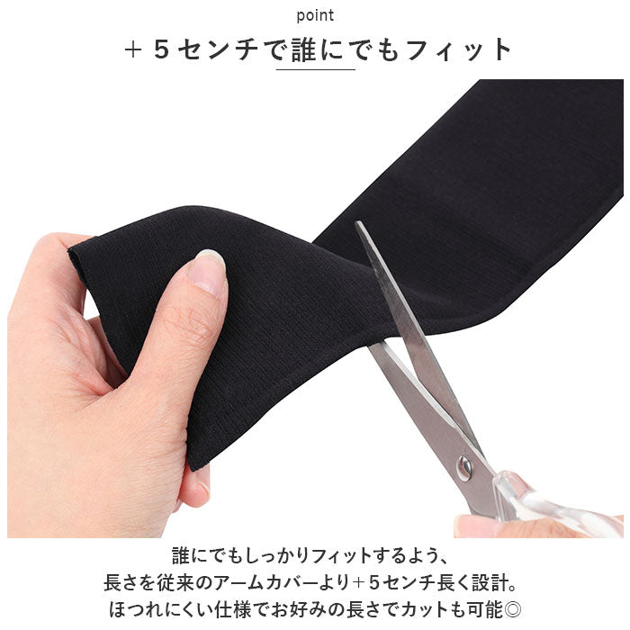 ・誰にでもしっかりフィットするよう、長さを従来のアームカバーより+5センチ長く設計。ほつれにくい仕様でお好みの長さでカットも可能◎