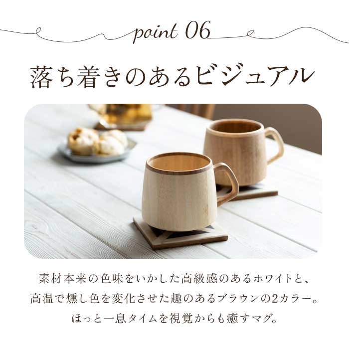 ・陶器やガラス製品に比べ熱伝導率が低いので、注がれる液体や外気の温度に左右されずマグ自体の温度が安定。