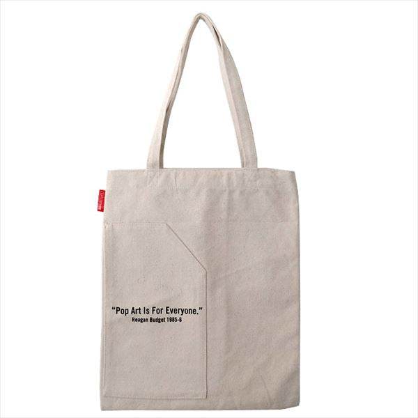 フラットなA4縦型サイズのトートはインパクト大。アンディ・ウォーホルの作品「Reagan Budget 1985-6 」「Have Gun Will Shoot, 1985-6,Poison Caution, 1985-6 」「Repent and Sin No More! 1985-6 」をプリント。