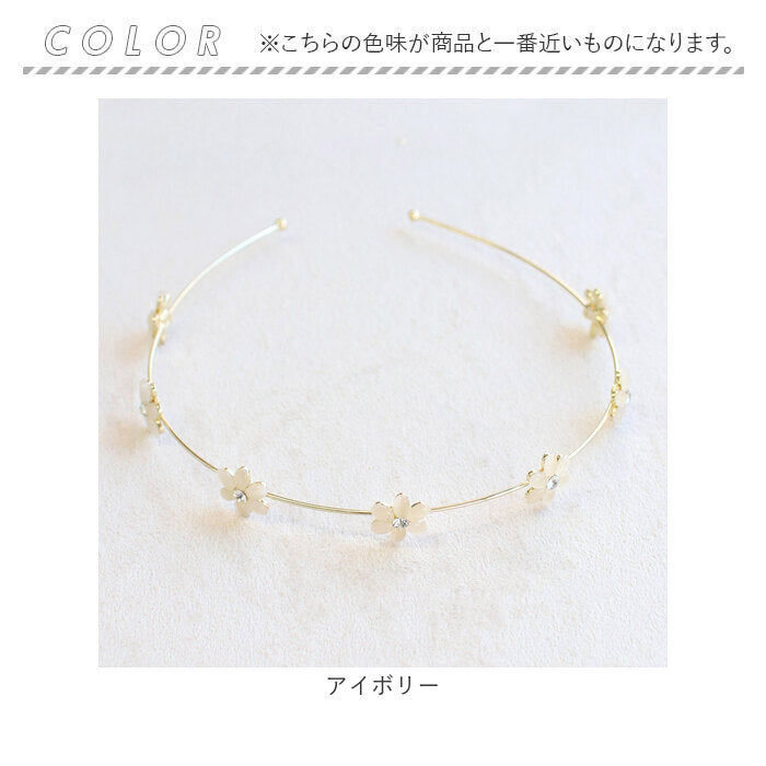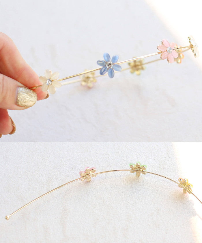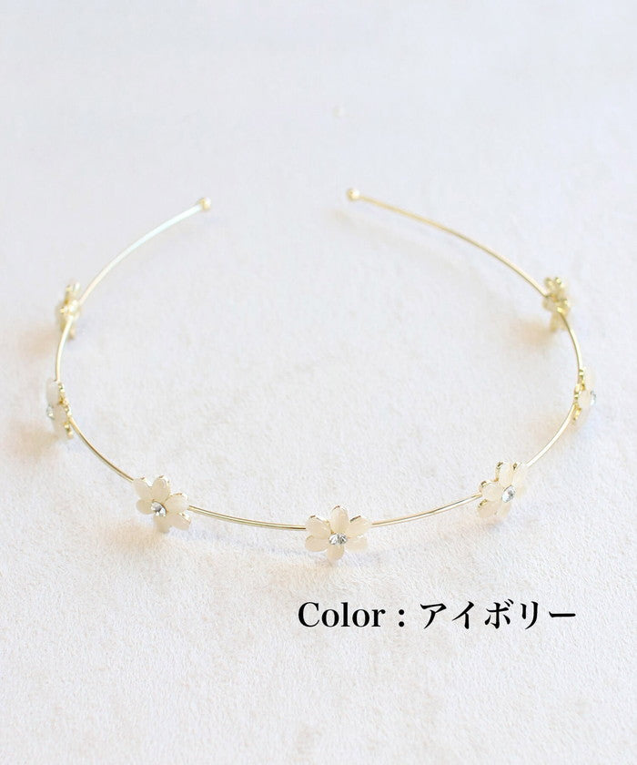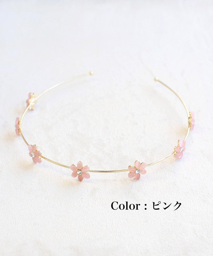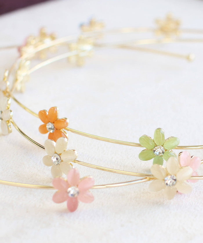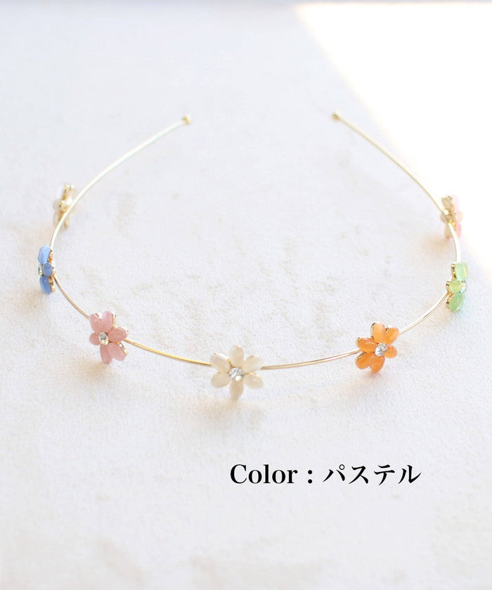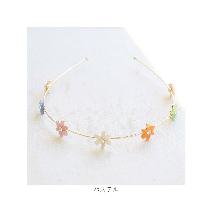 ・それは、軽量で快適なスリムな ゴールドのメタルバンドに並ぶ パステル、ピンク、アイボリーの 7つの花のカチューシャ。
