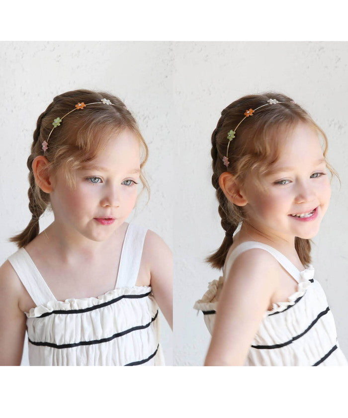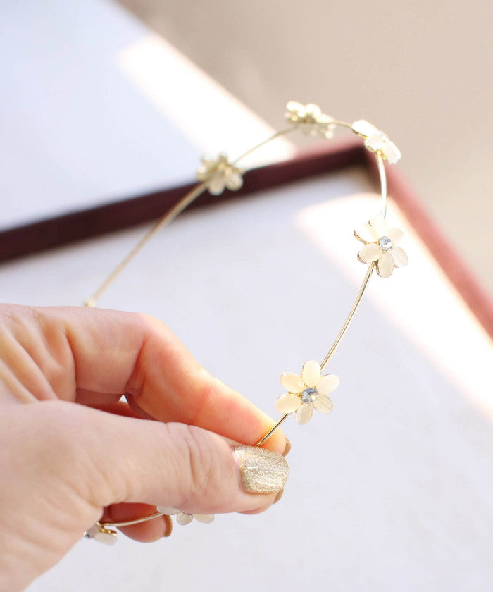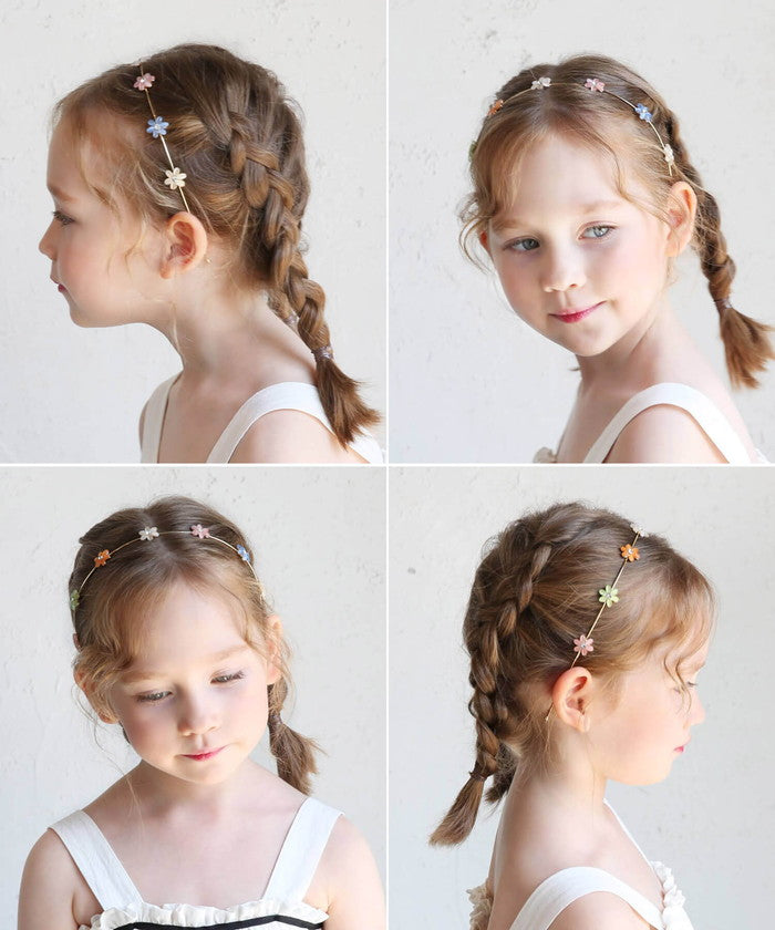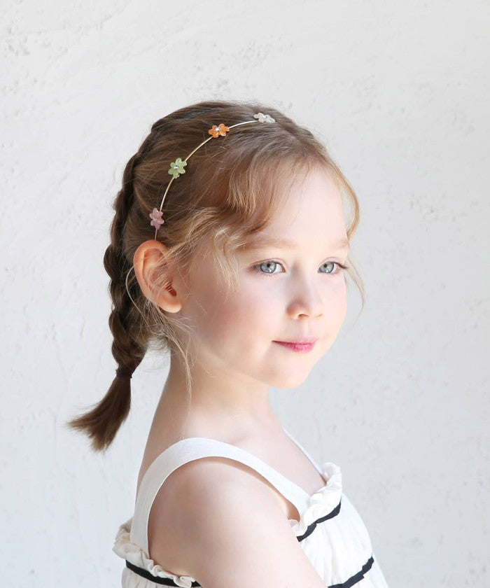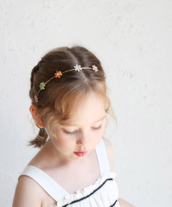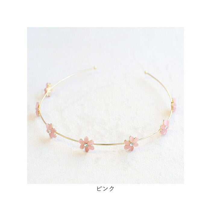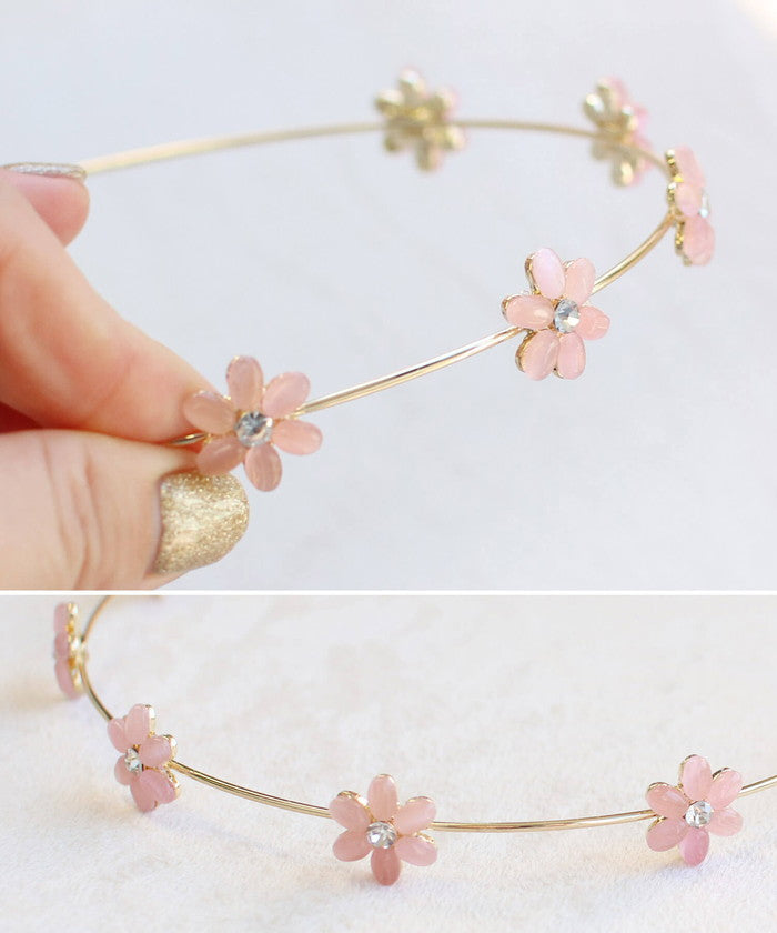 ・それは、軽量で快適なスリムな ゴールドのメタルバンドに並ぶ パステル、ピンク、アイボリーの 7つの花のカチューシャ。