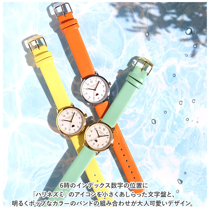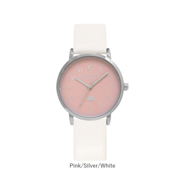 6時のインデックス数字の位置に「ハリネズミ」のアイコンを小さくあしらった文字盤と、明るくポップなカラーのバンドの組み合わせが大人可愛いデザイン。
