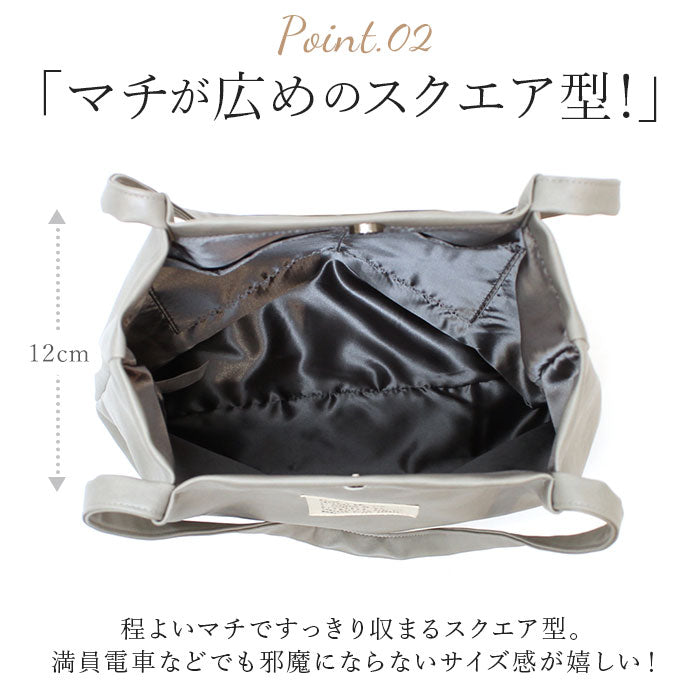 ・程よいマチを設け、すっきり収まるスクエア型。満員電車などでも邪魔にならないサイズ感が嬉しい!