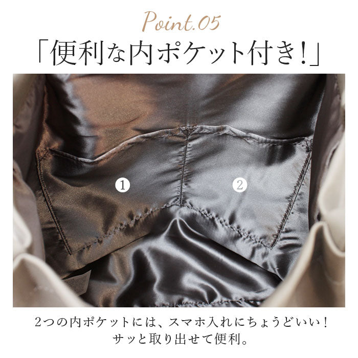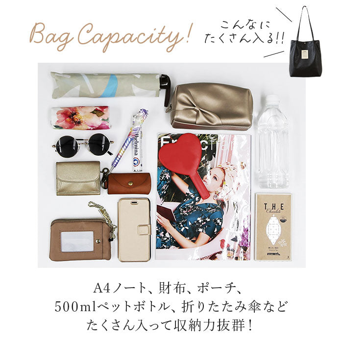 ・内側はA4サイズのファイルが合って向きにすっぽり。通勤や通学、お出かけに必要な小物がひとまとめ♪