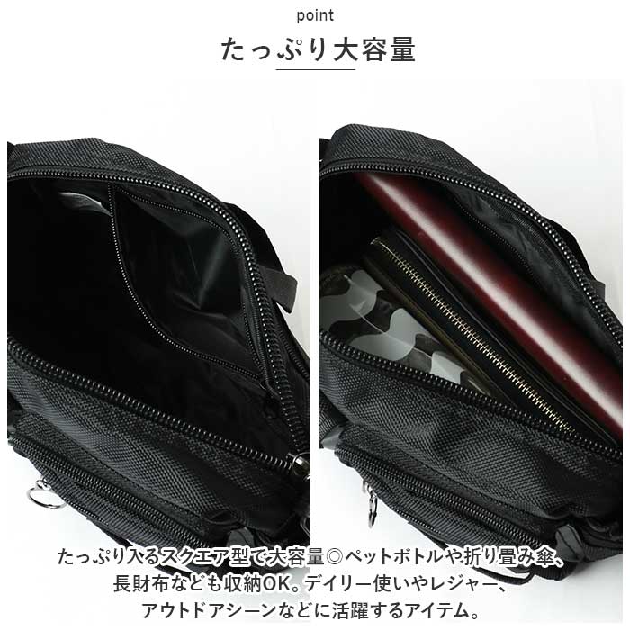 ・たっぷり入るスクエア型で大容量◎ペットボトルや折り畳み傘、長財布なども収納OK。デイリー使いやレジャー、アウトドアシーンなどに活躍するアイテム。