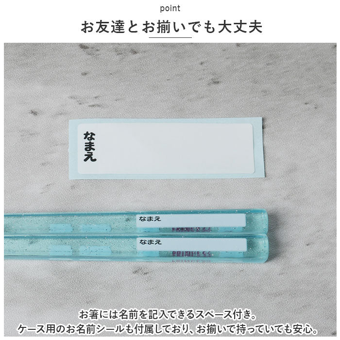 ・お箸には名前を記入できるスペース付き。ケース用のお名前シールも付属しており、お揃いで持っていても安心。