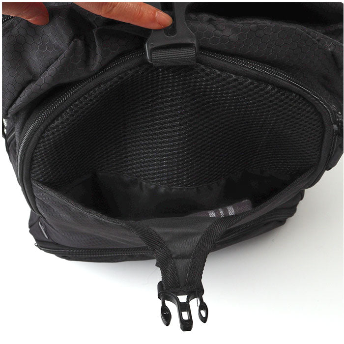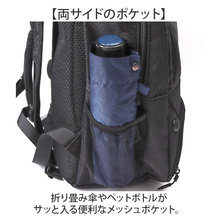 ・折り畳み傘やペットボトルがサッと入る便利なメッシュポケット。