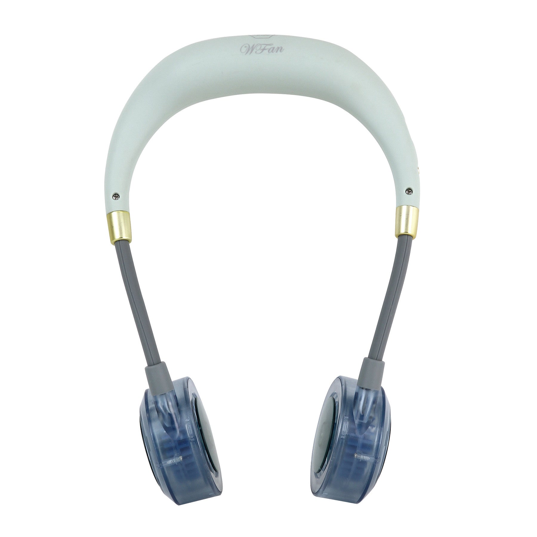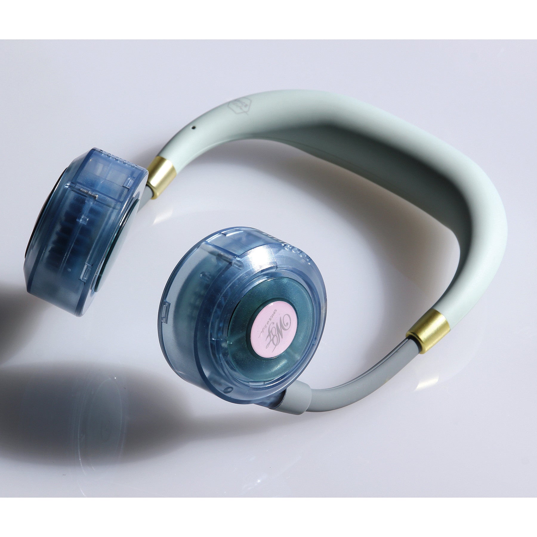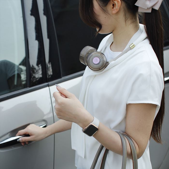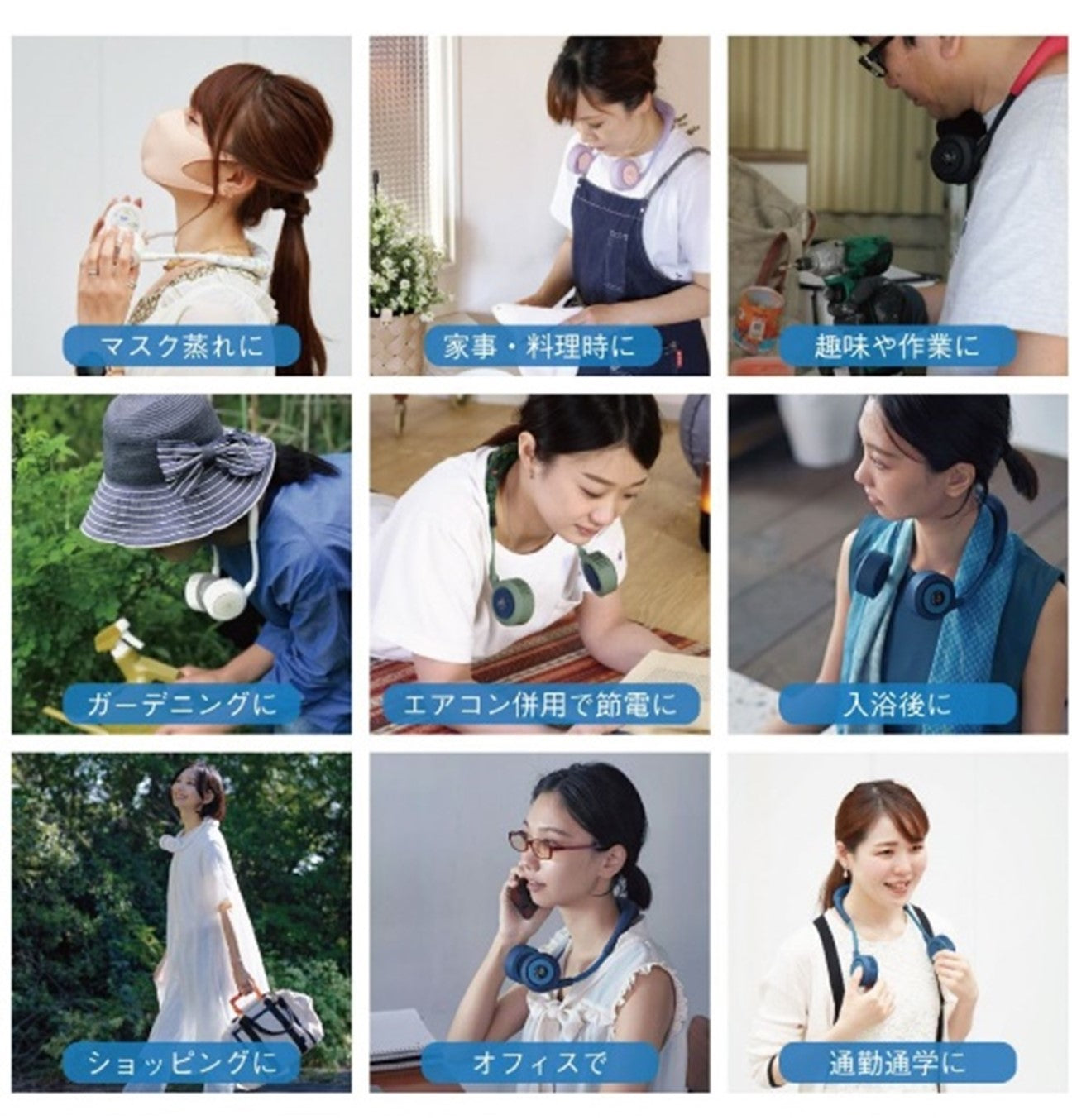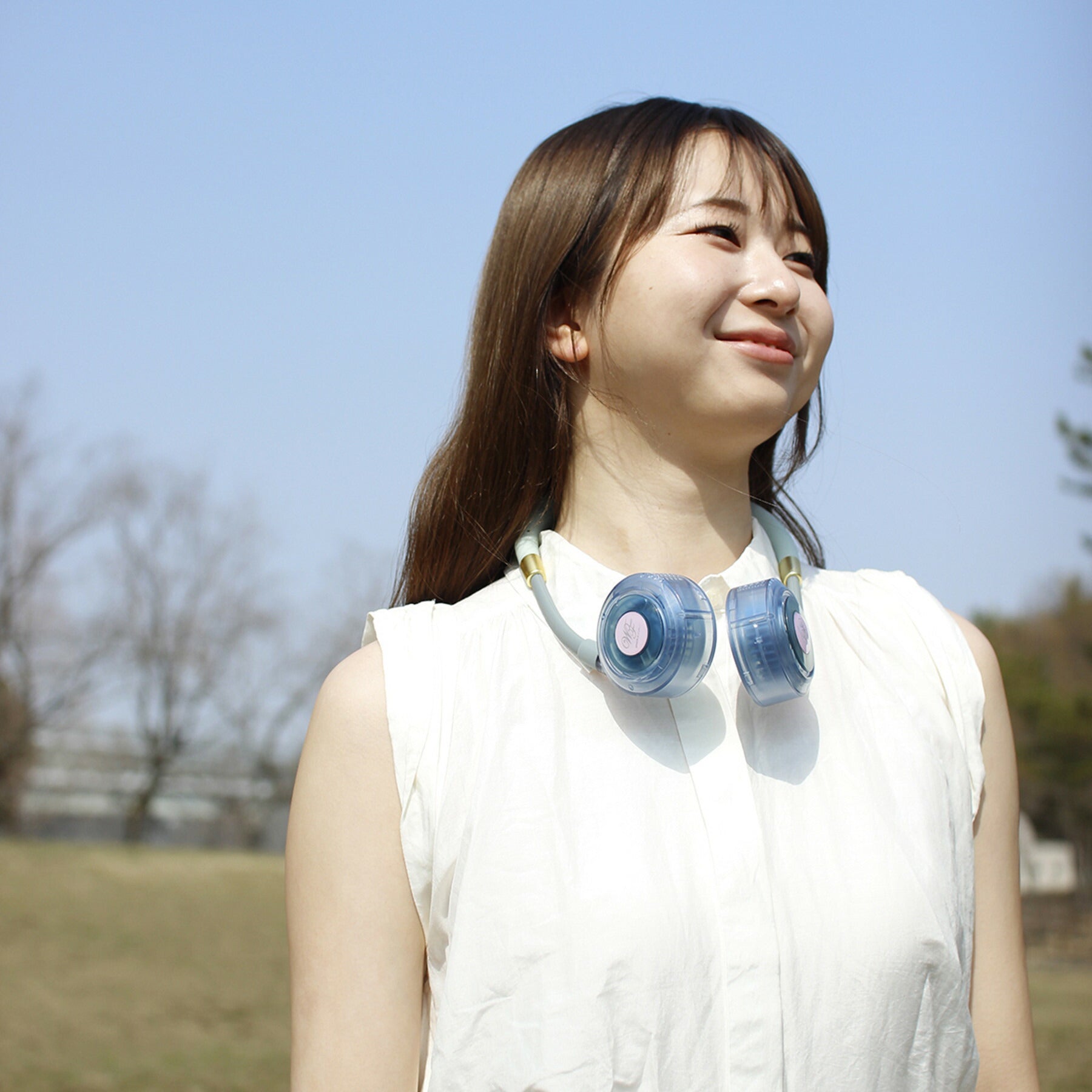 ・暑い時、暑い場所でいつでもどこでも、首にかけるだけの携帯用扇風機です。くすみカラーとクリアの大人可愛い、ファッション性を高めたデザイン。